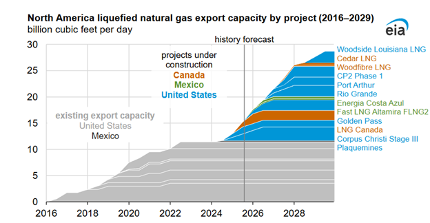 The buildout ahead is staggering. North American LNG export capacity will grow from 11.4 Bcf/d at the start of 2024 to approximately 28.7 Bcf/d by 2029 if projects under construction come online as planned. The U.S. alone expects to add an estimated 13.9 Bcf/d of new liquefaction capacity between 2025 and 2029, which would push total U.S. capacity past 22 Bcf/d. Five large U.S. projects have already reached Final Investment Decision (FID) and are actively under construction, Canada is adding two more facilities, and Mexico's Energía Costa Azul on the Pacific coast is expected to begin operations in early 2026. Taken together, North American additions are expected to represent more than 50% of global LNG capacity additions through 2029, according to the International Energy Agency.