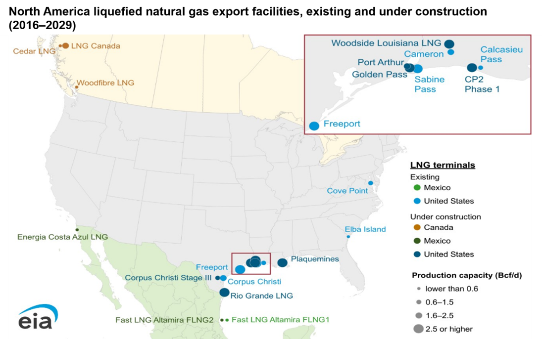 U.S. liquefaction capacity stands at approximately 15.4 billion cubic feet per day (Bcf/d). North America's LNG export infrastructure is heavily concentrated along the U.S. Gulf Coast due to the region's proximity to prolific shale gas production, deep-water port access, and an existing pipeline network. In 2025, Canada opened its first industrial-scale LNG terminal: LNG Canada, located in Kitimat, British Columbia. With two liquefaction trains capable of producing 1.84 Bcf/d combined, LNG Canada ships exclusively to Asian markets. Mexico has also entered the export market in a smaller way, with a floating LNG facility — Altamira LNG — shipping its first cargo in August 2024.